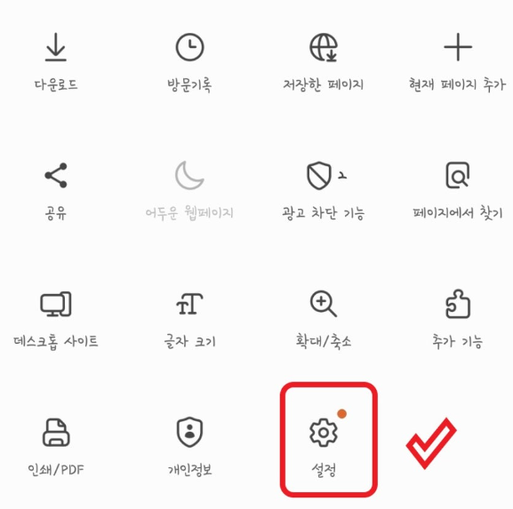 1. 삼성 인터넷브라우저 실행 후 줄 3개를 선택하고 설정을 선택합니다.