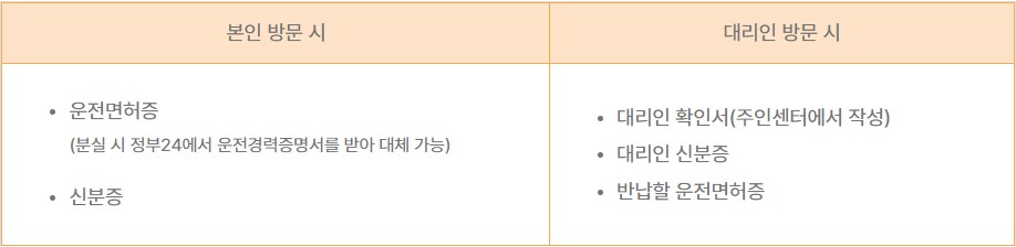 고령자의 운전면허 반납은 주민등록 상 등록된 주소지의 주민센터를 방문하여 '고령 운전자 면허 반납 원스톱 서비스'를 이용하면 됩니다. 이를 위해 운전면허증과 지원 신청서를 준비하여 주민센터를 방문하면 됩니다. 만약 면허증을 분실한 경우, 인근 경찰서나 정부24 홈페이지에서 운전 경력 증명서를 발급받은 후, '운전경력증명서'와 신분증을 함께 제출하면 반납 절차를 진행할 수 있습니다.