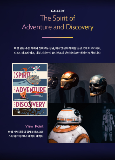 9개의 테마갤러리와 프롤로그 / 250여점의 원본아트아트워크, 기념품등 디즈니의 작품들, 14개의 인터랙티브요소