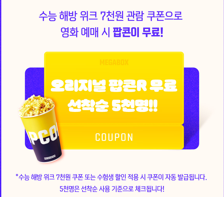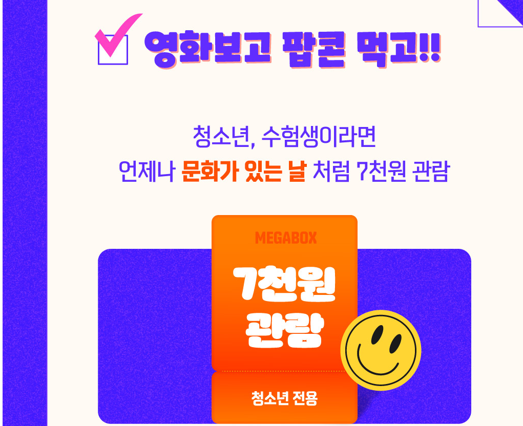 청소년과 수험표를 소지한 수험생이라면 매월 마지막 주 수요일 문화가 있는 날처럼 7천원에 영화를 관람할 수 있으며 선착순 5천명에게 팝콘무료증정을 받을 수 있습니다.