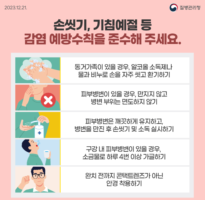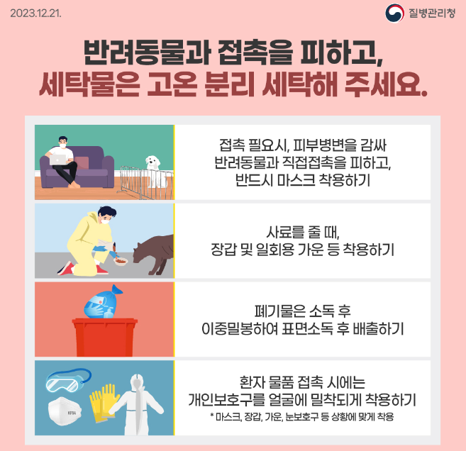 엠폭스는 동물에 의해 감염이 많이 되므로 개인위생수칙을 준수하는 것이 무엇보다 중요합니다.