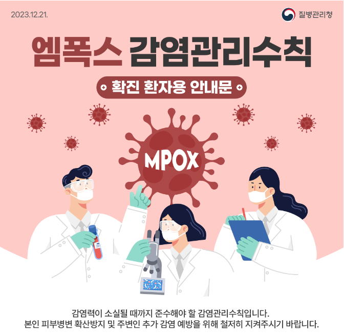 엠폭스 진단검사 검사결과 양성으로 확인되면, 증상에 따른 대증치료를 받게 되는데, 의료진은 환자의 중증도와 사망 위험도를 고려하여, 필요시 항바이러스제 같은 치료제를 투여하게 됩니다. 항바이러스제(테코비리마트)는 환자에게 기대되는 임상적 유익성이 위해성을 상회하는 경우에만 사용하게 되므로, 치료와 관련해서는 담당주치의와 상의가 필요합니다.
