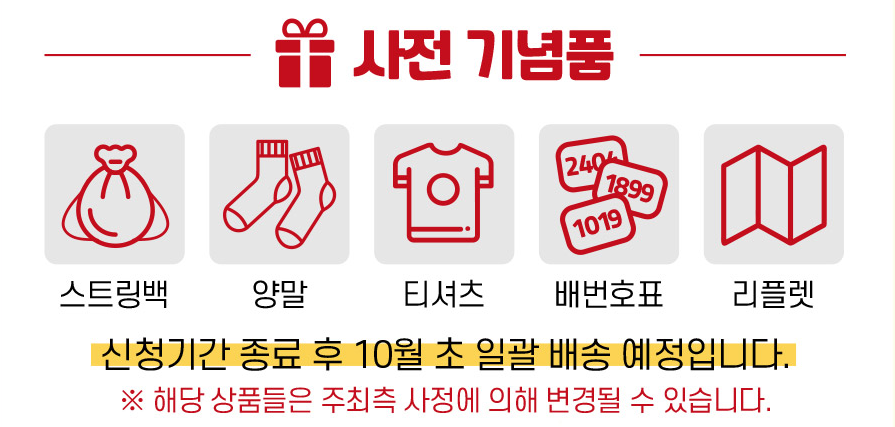 참가신청 완료시 사전 기념품으로 스트링백,양말, 티셔츠, 배번호표등을 먼저 받고 행사 당일 현장에서도 다양한 기념품을 받을 수 있습니다.