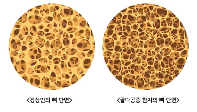 골다공증은 뼈의 밀도와 질량이 감소하거나 뼈의 구조 및 강도에 변화가 생겼을 때 발달하는 질병입니다.즉, 뼈에 구멍이 생긴다고 생각하면 쉽게 이해할 수 있습니다. 이는 뼈의 강도를 저하시켜 골절(뼈가 부러짐)이 발생할 위험이 증가하게 만듭니다. 남성은 생물학적, 사회문화적으로 여성보다 더 신체를 쓰는 활동을 많이 하는 편이라 뼈와 근육이 일상적으로 단련되기 때문에 골다공증 위험이 비교적 덜합니다 반면에 여성은 평균적으로 남성보다 활동량이 적고 생식 활동이 가능한 동안 여성 호르몬의 보정을 받아 골밀도가 완만하게 떨어지다 폐경이 되는 순간 여성 호르몬의 보정이 끝나 급격하게 떨어지기 때문에 더 위험합니다.