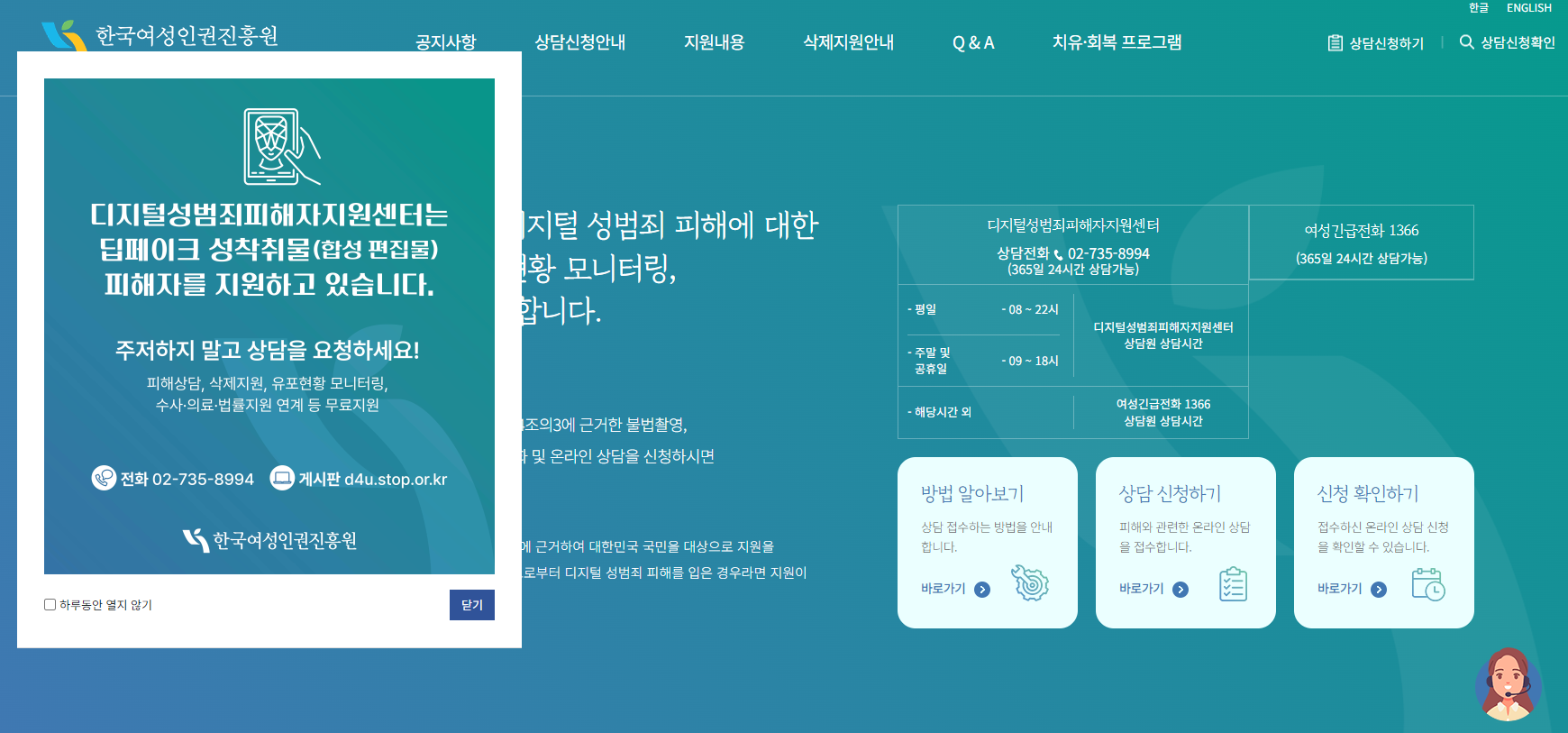 1. 유포된 영상에 대해서 모니터링이나 삭제가 필요하다면 여성가족부가 운영하는 디지털 성범죄 피해자지원센터에서 피해 상담 및 삭제 지원을 받을 수도 있습니다.
