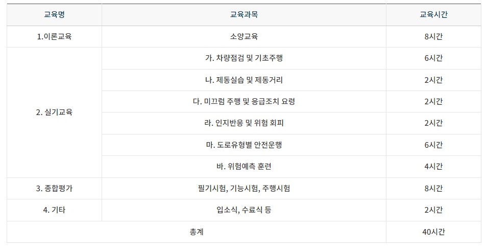 총 40시간(5일 과정) : 이론교육 8시간, 실기교육 22시간, 종합평가 8시간, 기타 2시간