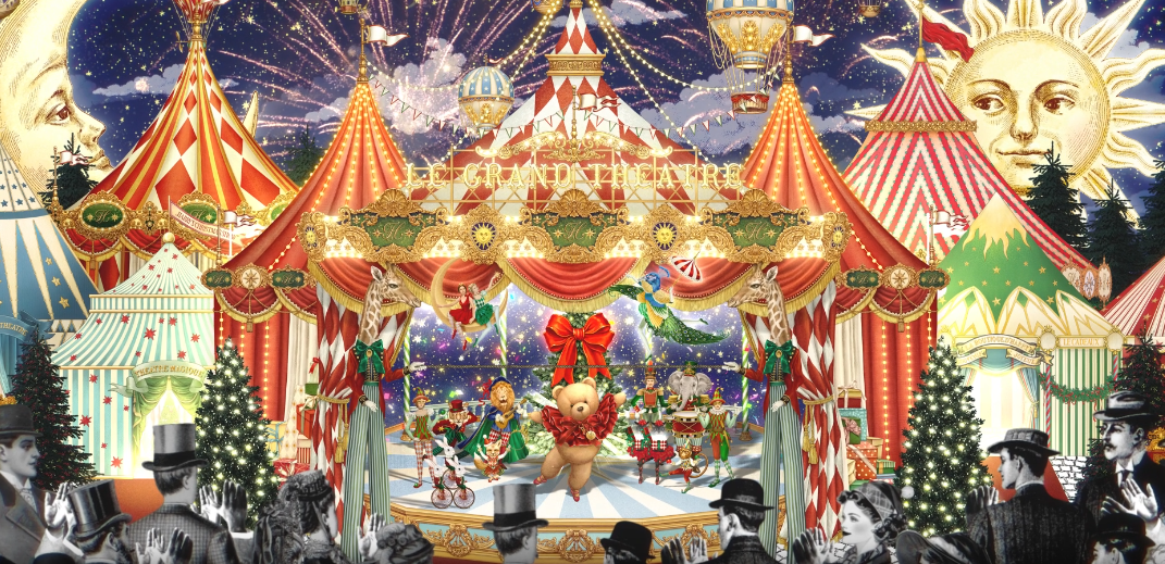 본점에서 생겨난 거대한 빨간 리본이 신비로운 성으로 변하게 하고 다채롭고 놀라운 홀리데이의 순간들을 펼쳐냅니다